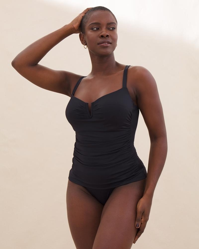 V znamená vítězství a tento tankinový top s výstřihem do V je rozhodně vítězem. Lichotí vaší postavě strategicky umístěnými volánky po stranách a na ozdobném prvku s výstřihem do V. Nastavitelná ramínka zajišťují perfektní padnutí.