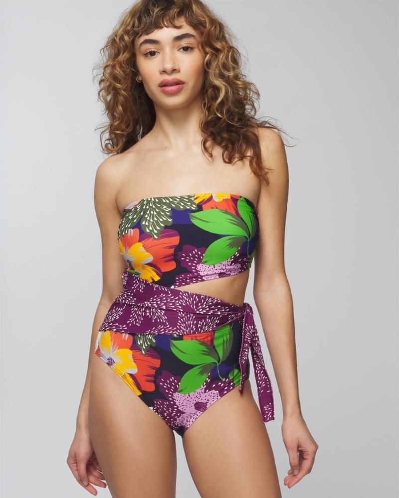 シックなタイフロントのディテールがスタイリッシュなバンドゥワンピース。ビーチでのデイルックをワンランクアップさせてくれます。サイドのカットアウトがチラリと見えるので、セクシーな雰囲気を保ちながらも、しっかりカバーしてくれます。つばの広い帽子やパッカブルバイザーをアクセサリーとして組み合わせれば、太陽の下で楽しむ準備万端のアンサンブルが完成します。